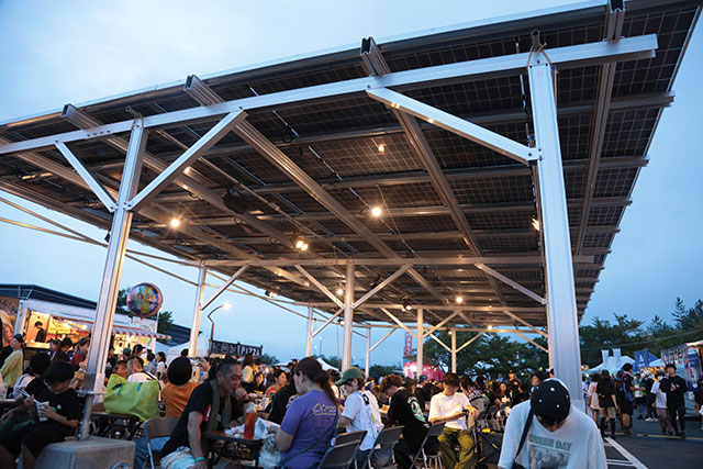 フードエリアの屋根部分に太陽光発電パネルを設置し、発電した電力を会場内の蓄電池に供給、蓄えられた電力を、Parkifeステージの運営に活用しました。